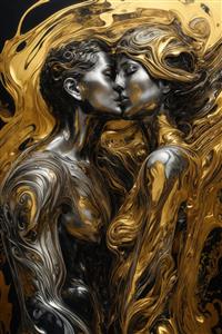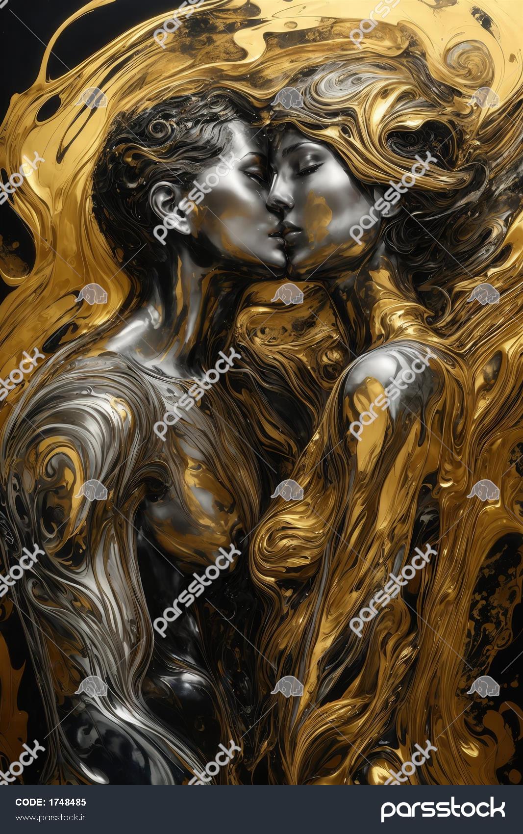 عکس بوسه زوج با جریان‌های طلایی و نقره‌ای در سبک آبستره