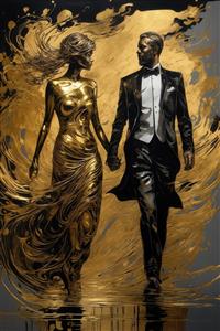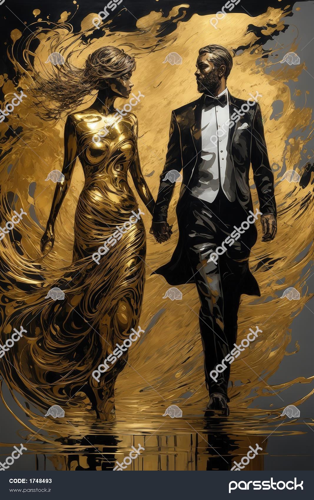 تصویر زوج زن طلایی و مرد کت‌وشلوارپوش لوکس در حال حرکت