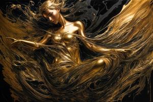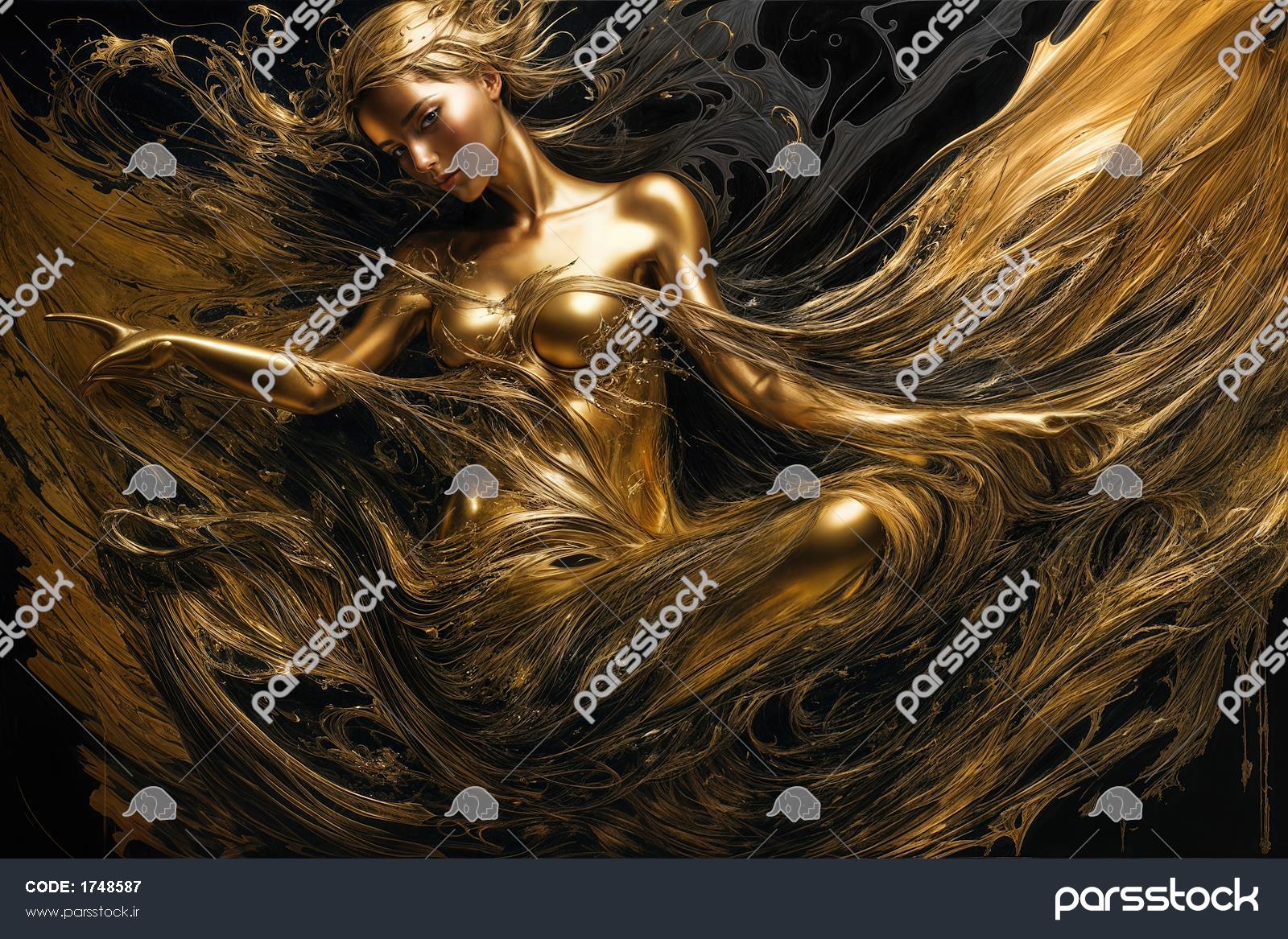 تصویر زن طلایی مجسمه‌مانند فانتزی با لباس آبستره برای چاپ روتختی