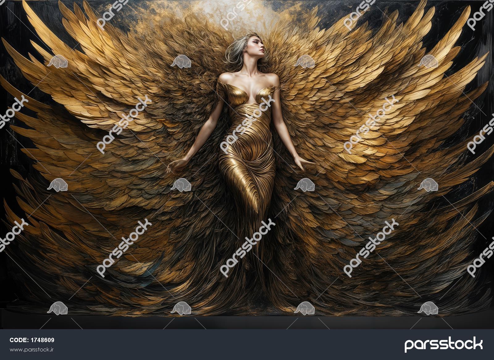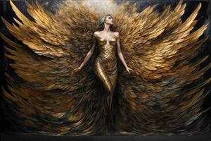 عکس الهه طلایی با لباس مجسمه‌ای فانتزی برای تابلو دیواری مدرن