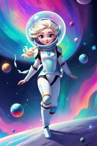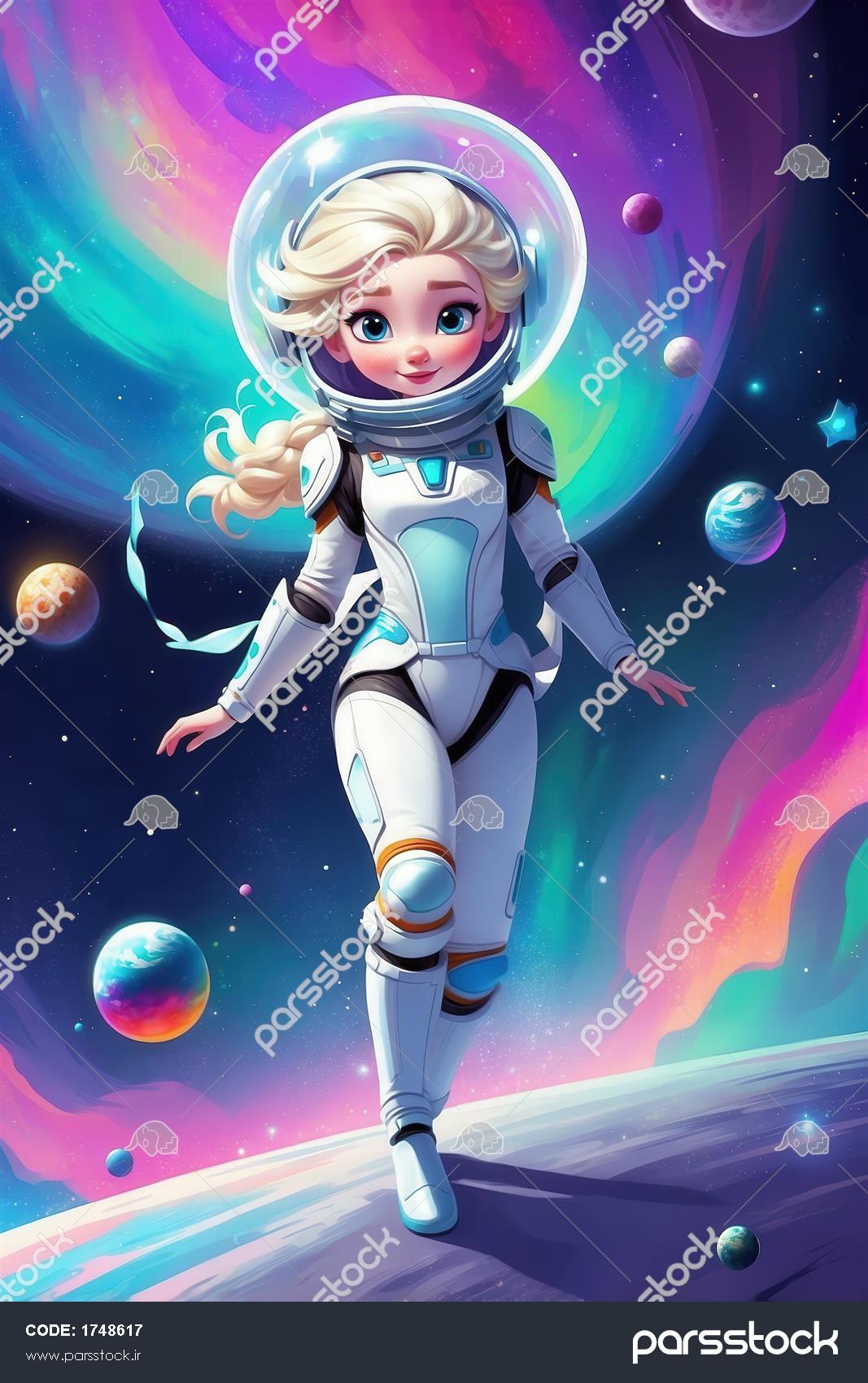 طرح فانتزی السا فضانورد با لباس سفید در کهکشان رنگین‌کمان