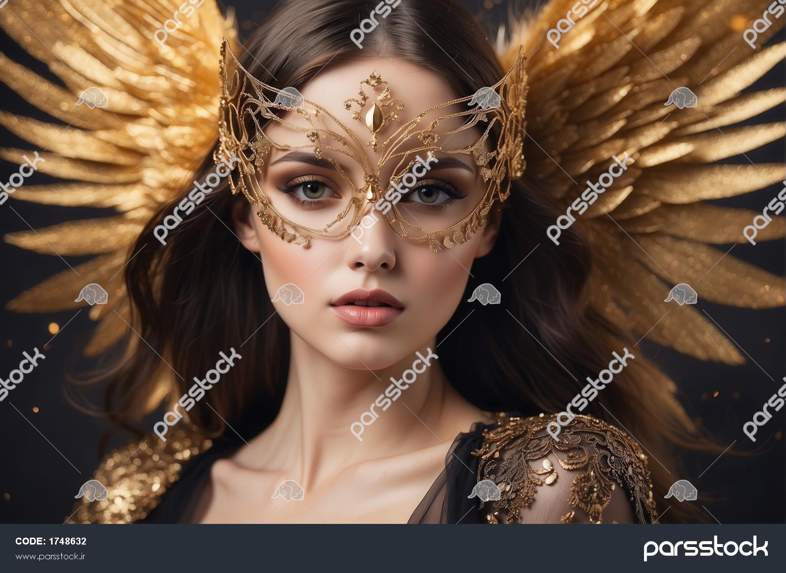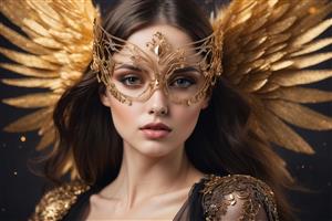 پرتره زن با ماسک طلایی بالدار و لباس مشکی برای چاپ کوسن