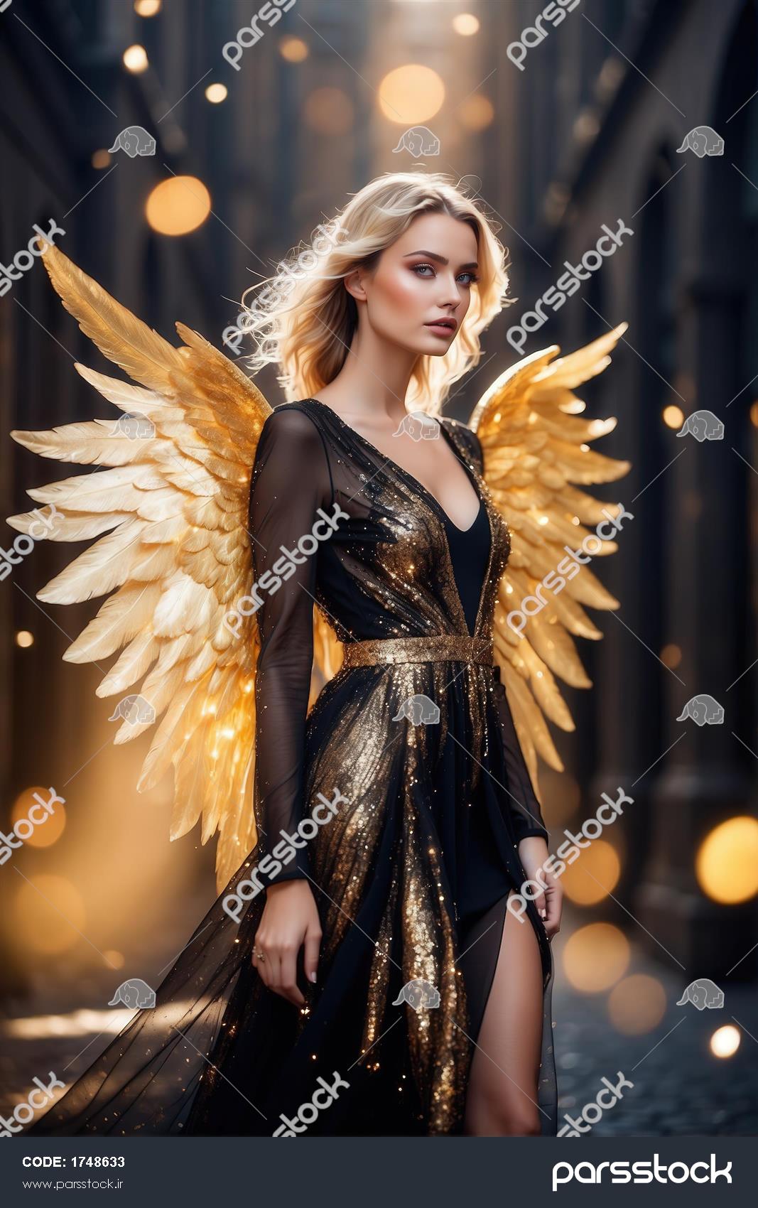 عکس فرشته زن با لباس ماکسی مشکی طلایی در فضای تاریک شهری