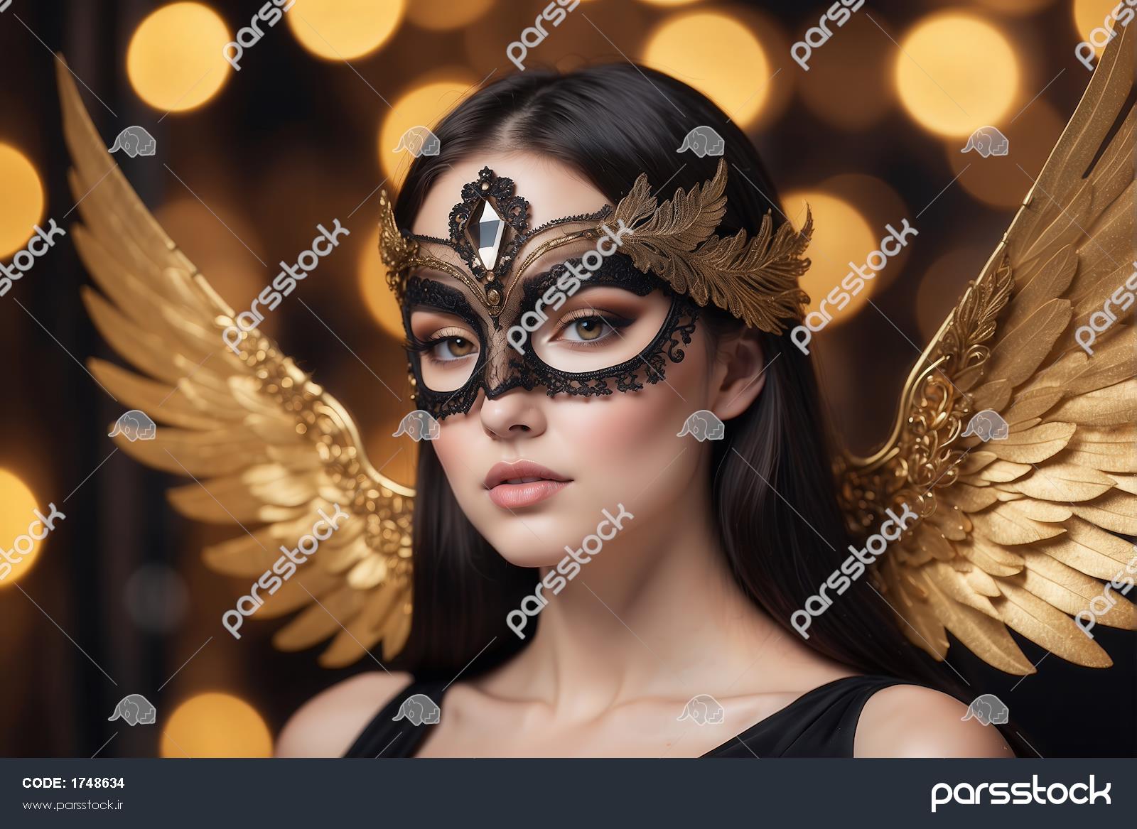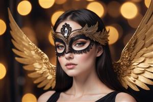 پرتره زن با ماسک توری طلایی و بال برای تابلو دکوراتیو فانتزی
