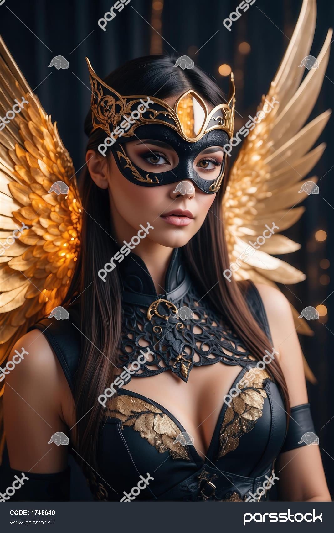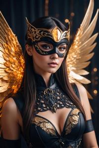 پرتره زن در لباس مشکی با ماسک و بال طلایی برای تابلو فانتزی