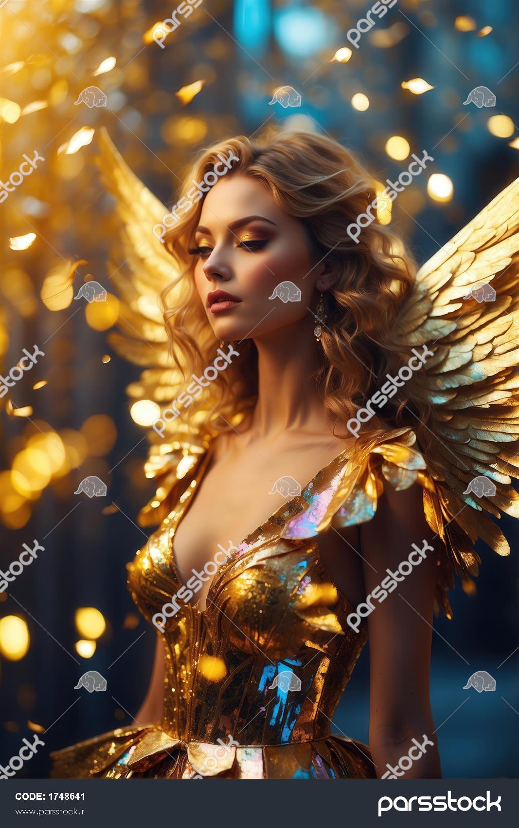 تصویر زن فرشته با لباس طلایی براق و بال‌های پر دار برای چاپ