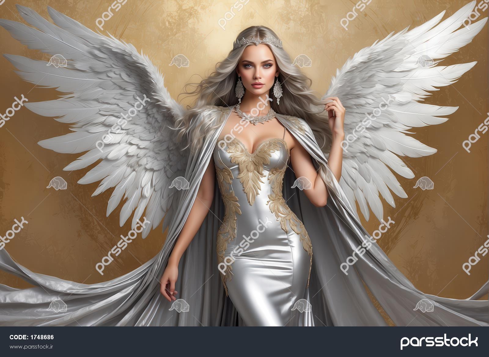 عکس پرتره فرشته زن با لباس نقره‌ای و شنل طلایی و بال سفید در زمینه طلایی نورانی