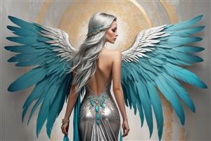 عکس فرشته زن با موی نقره‌ای و بال‌های بزرگ در پس‌زمینه طلایی و فیروزه‌ای