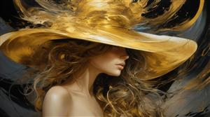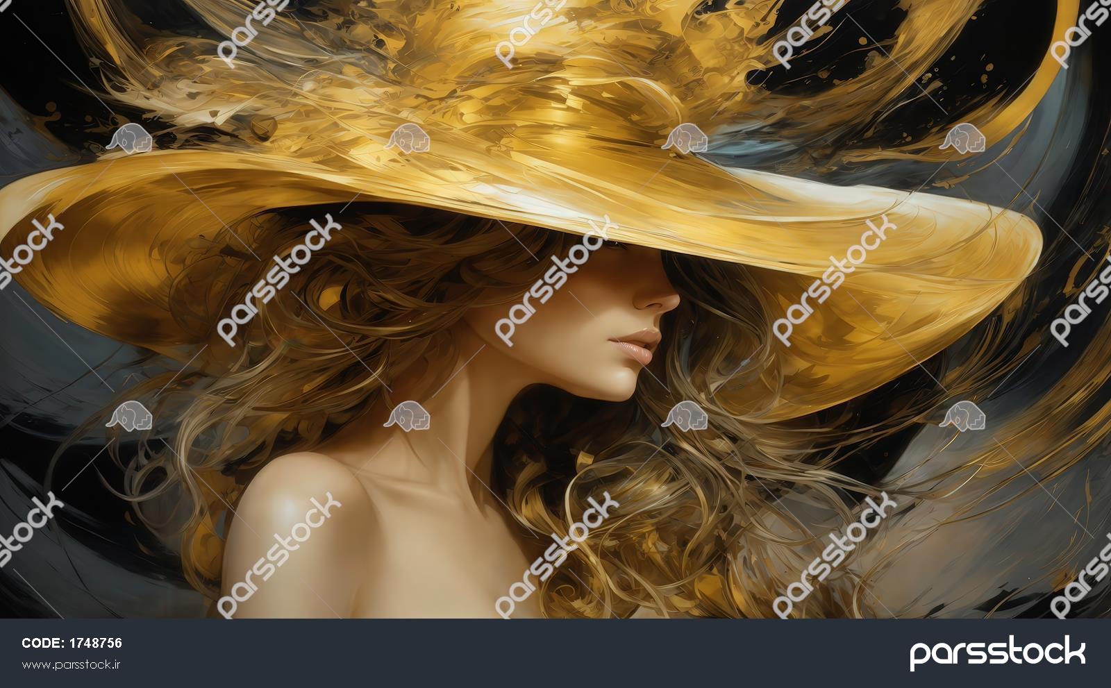 تصویر زن با کلاه بزرگ طلایی و موهای بلوند مواج برای پرده چاپی
