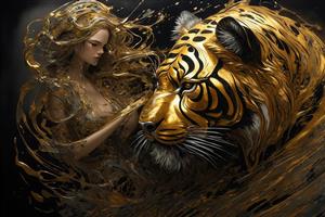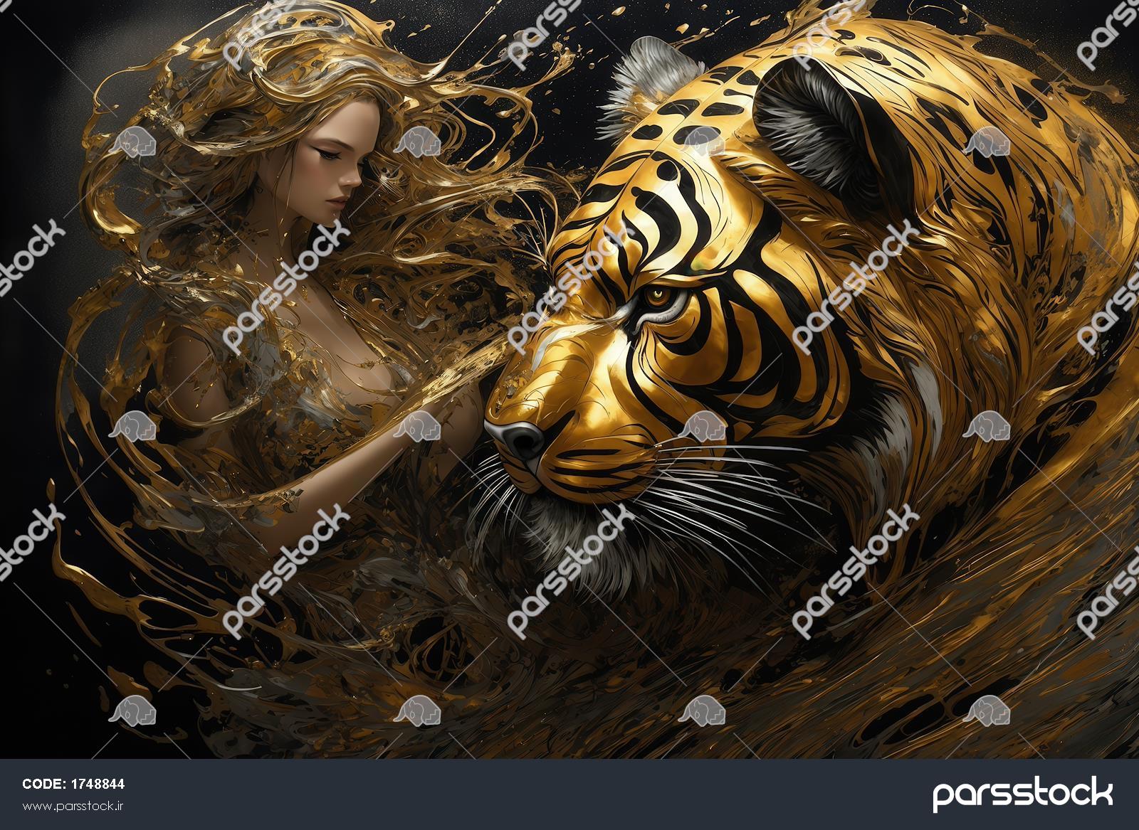 طرح ببر و الهه‌ی طلایی مو بلند با سبک فانتزی برای پوستر دیواری خاص
