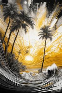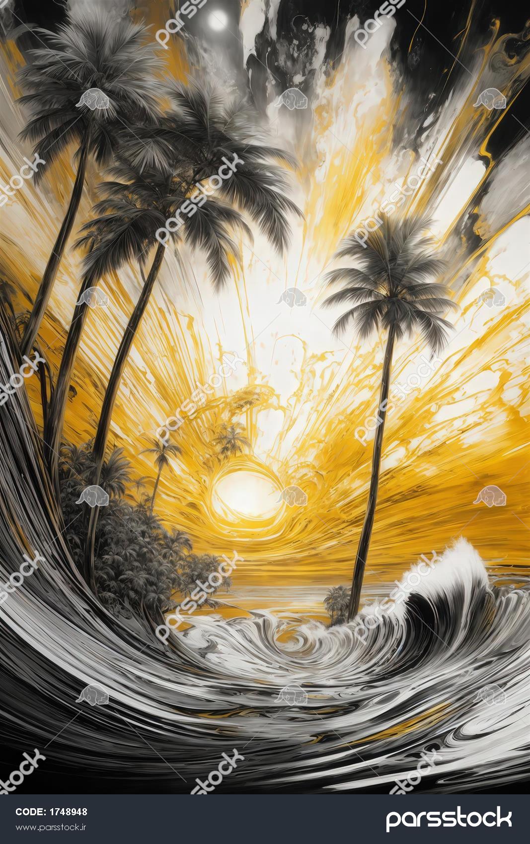 تصویر نخل‌های سیاه و سفید با موج سهمگین و نور خورشید طلایی