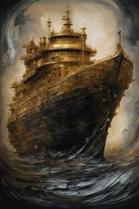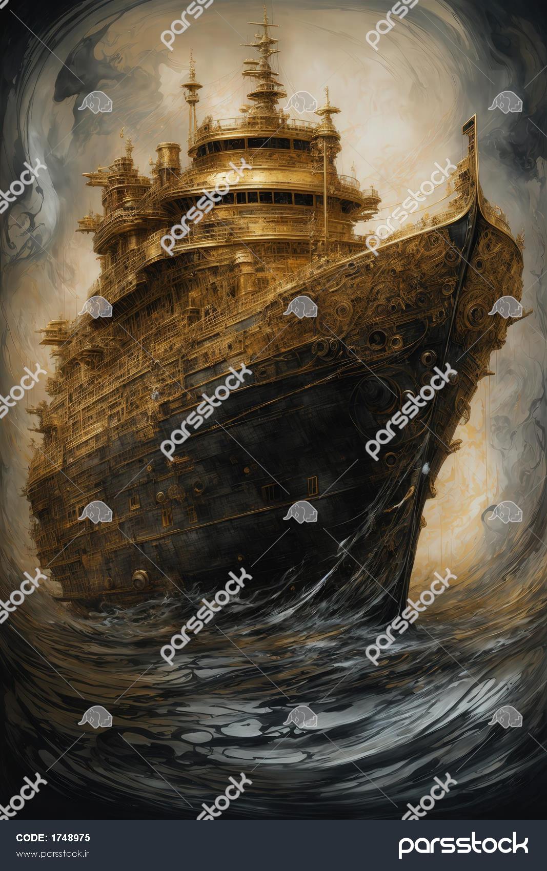 تصویر تابلو کشتی کروز لوکس طلایی در امواج متلاطم آبستره