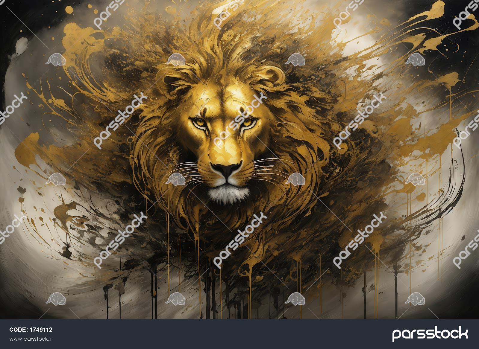 پرتره‌ی شیر طلایی با یال‌های در حال انفجار و پاشش رنگ دکوراتیو