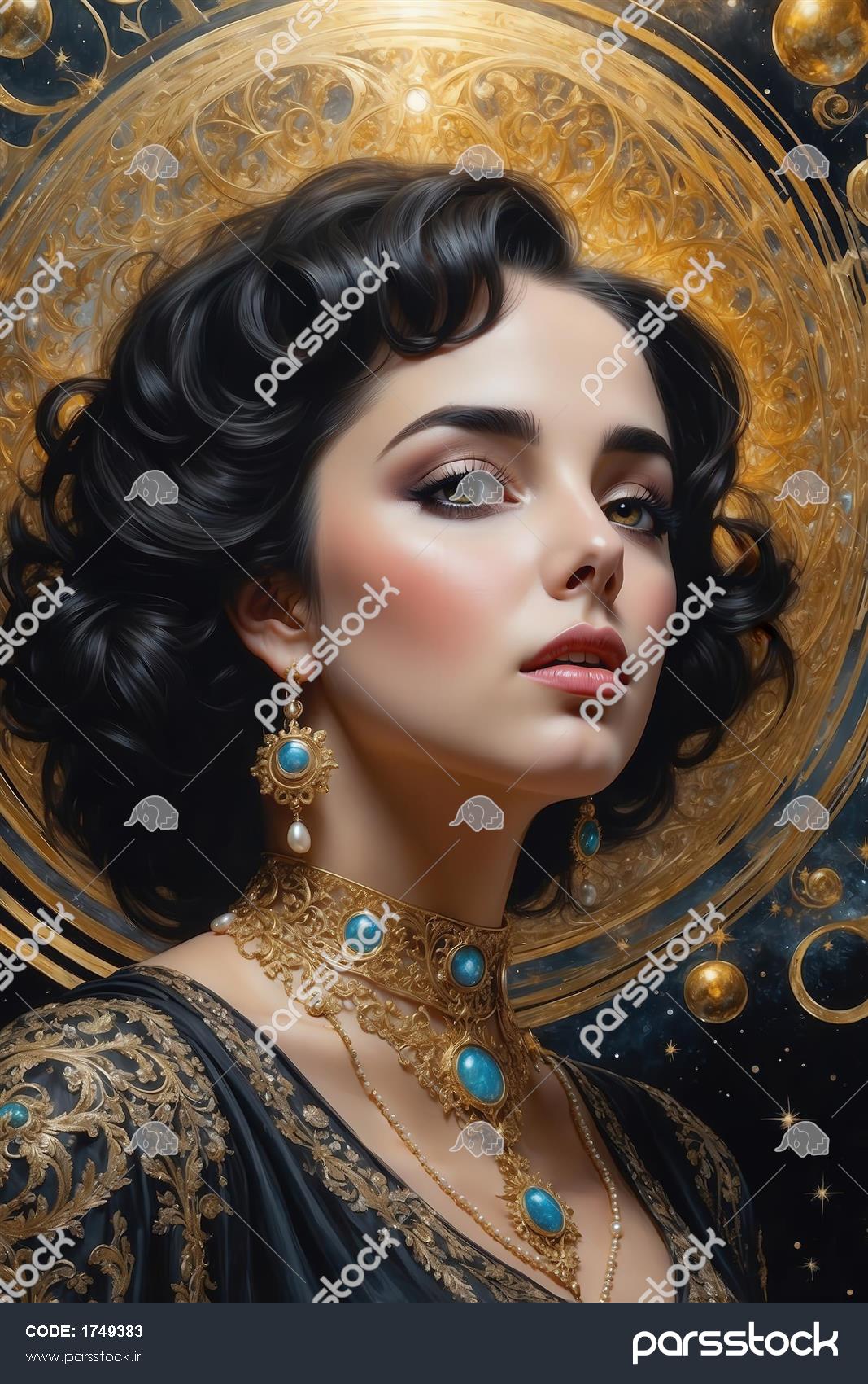 پرتره بانوی زیبا با گردنبند فیروزه‌ای و طلایی برای دکور
