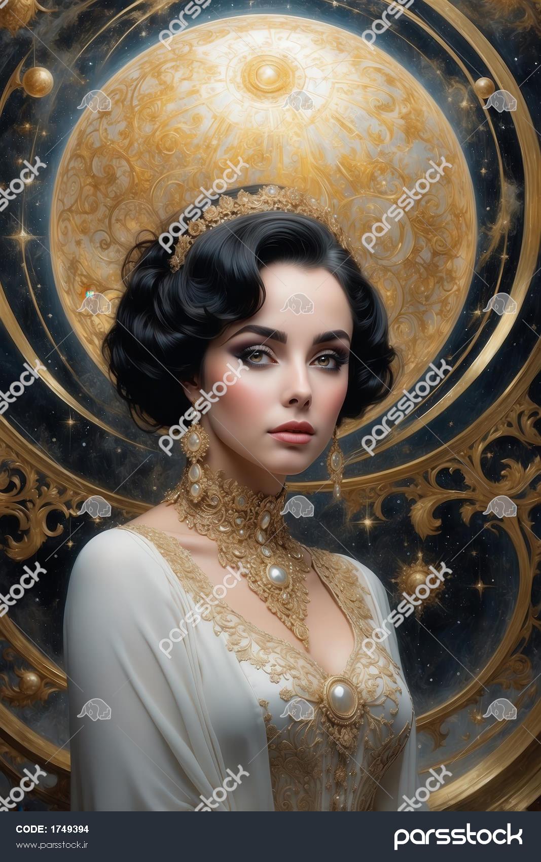 عکس زن زیبا با تاج و گردنبند طلایی و ماه بزرگ آبی برای چاپ عکس زن با لباس سفید و تاج طلایی در کنار ماه بزرگ برای چاپ پرتره بانوی زیبا با تاج نقرهای مرواریدی در پسزمینه طلایی عکس زن با لباس طلایی و سفید با موهای جمعشده برای پوستر تصویر بانوی کلاسیک با لباس خاکستری و جواهرات مروارید برای تابلو عکس زن زیبا با موهای جمعشده در قاب دایرهای طلایی سلطنتی طرح پرتره زن با حجاب سر طلایی در فضای کهکشانی برای چاپ پرتره بانوی زیبا با گردنبند فیروزهای و طلایی برای دکور عکس زن با لباس سفید و طلایی و گردنبند فیروزهای برای تابلو پرتره زن سلطنتی با کلاه طلایی و ماه کامل برای دکور خانه نمایش همه