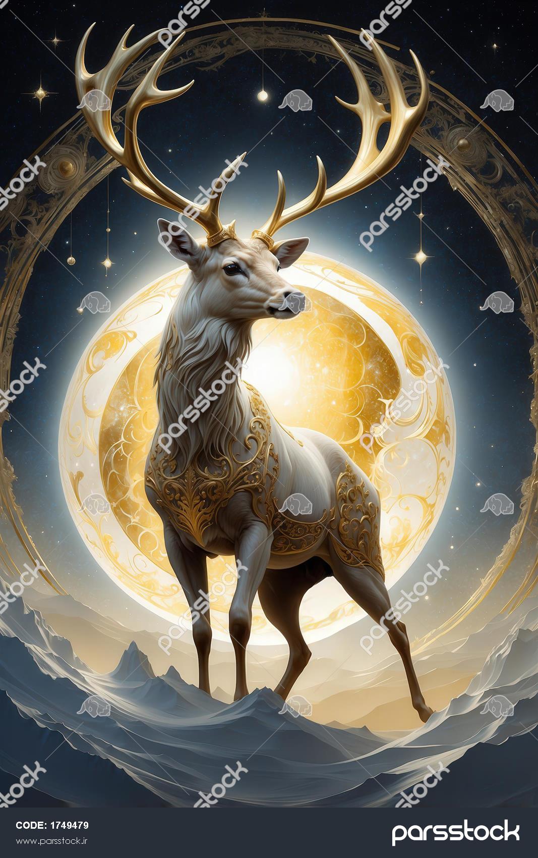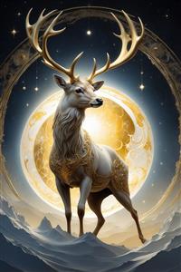 تصویر آهوی سفید و طلایی شاخ‌بلند با پس‌زمینه ماه در کوهستان برفی