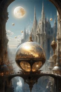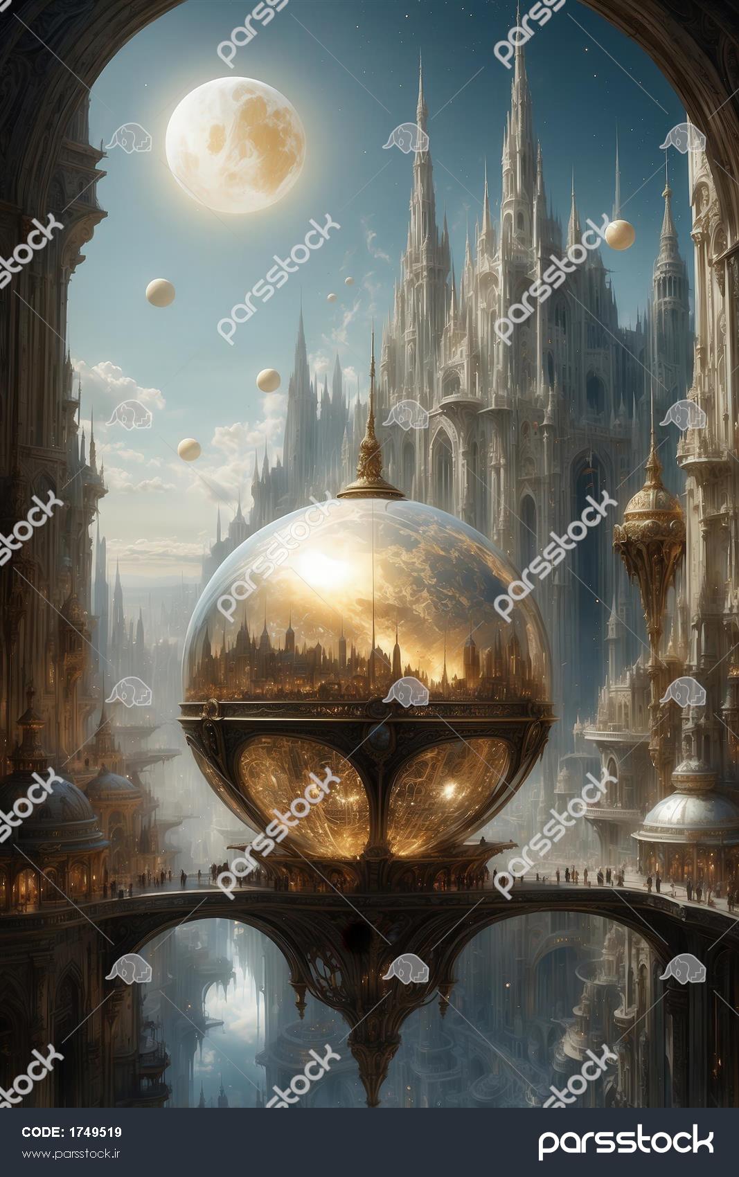 طرح شهر آسمانی و قلعه سفید در کره شیشه‌ای زیر ماه کامل