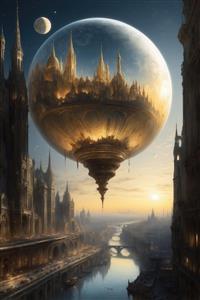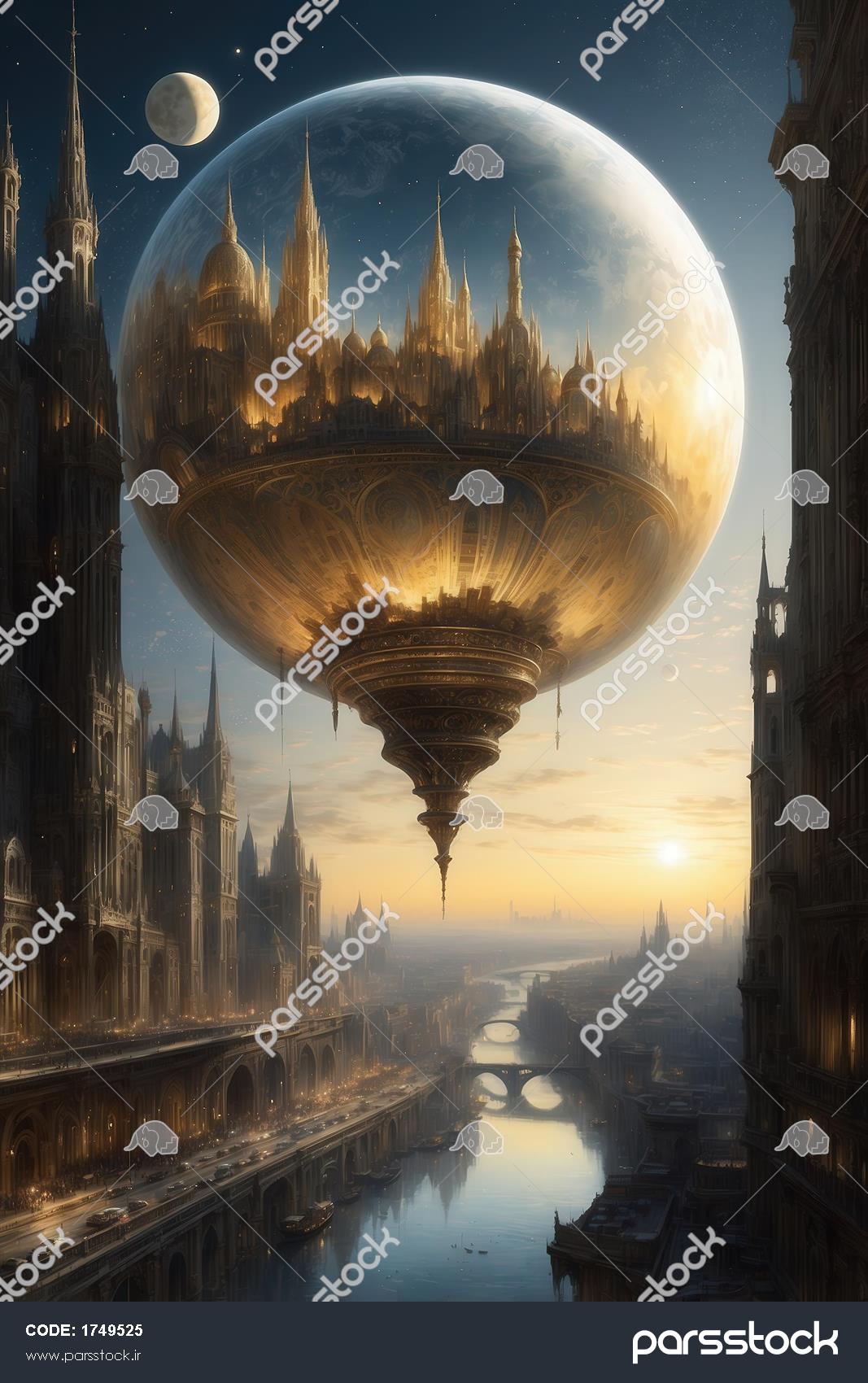 عکس شهر معلق در حباب طلایی بالای رودخانه در نور غروب