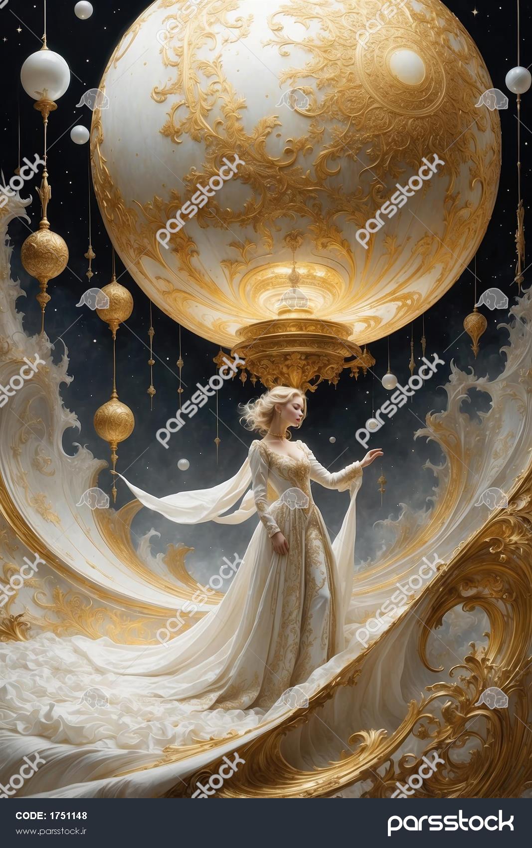 تصویر زن فانتزی با لباس حریر سفید در کنار ماه عکس زن فانتزی ایستاده مقابل ماه کامل با لباس مجلل عکس زن فانتزی با لباس سفید در درگاه طلایی تصویر فانتزی زن با لباس بلند در فضای کهکشانی تصویر فانتزی زن با لباس سفید توری و پسزمینه ماه تصویر زن فانتزی با لباس کار شده و گوی درخشان تصویر فانتزی مرد بلوند با لباس سلطنتی سفید و طلایی تصویر زن فانتزی با لباس دکلته و تزیینات توری سفید فرشته بلوند با بالهای طلایی درخشان و لباس سفید در معماری مجلل تصویر سیندرلا بر روی هلال ماه با لباس آبی در قاب بیضی طلایی دکوراتیو مشاهده همه