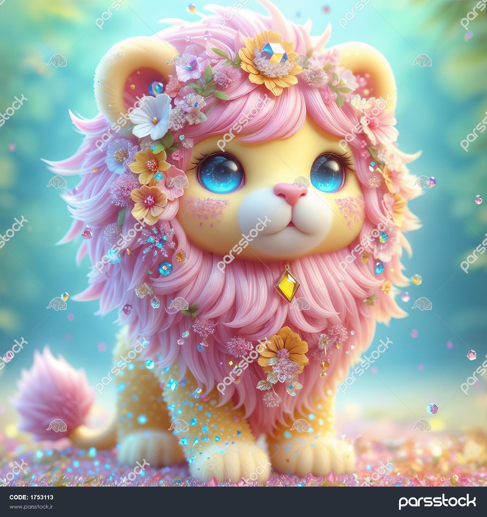 طرح لایه باز شیر کوچولوی صورتی با یال گل‌گلی و تزیینات جواهر نشان ویژه چاپ کاغذ دیواری سه بعدی اتاق کودک و نوزاد