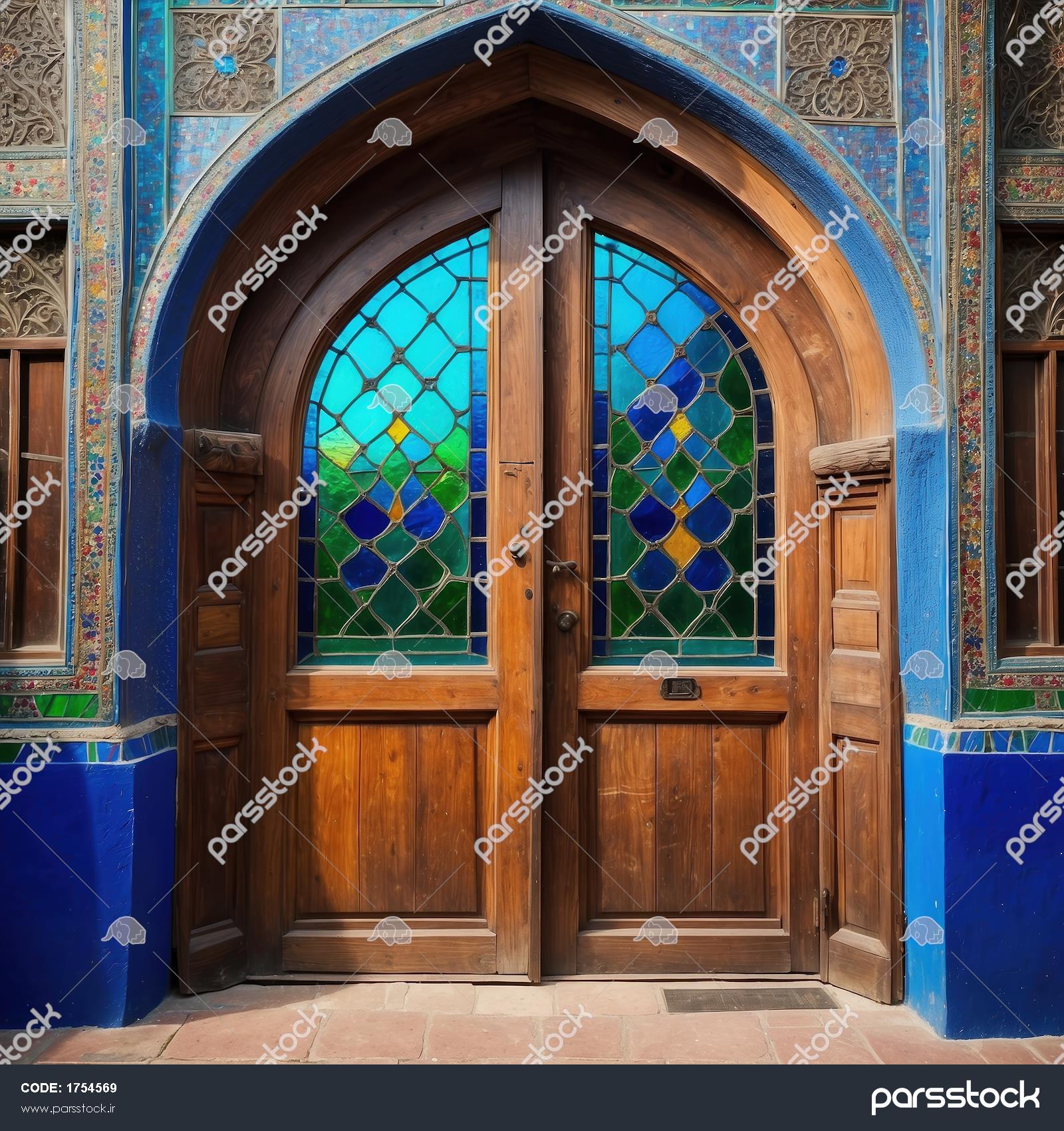 ورودی باشکوه با طاق جناغی و شیشه‌های ویترای اسلیمی برای دکوراسیون پشت میز پذیرش و پوستر دیواری پذیرایی