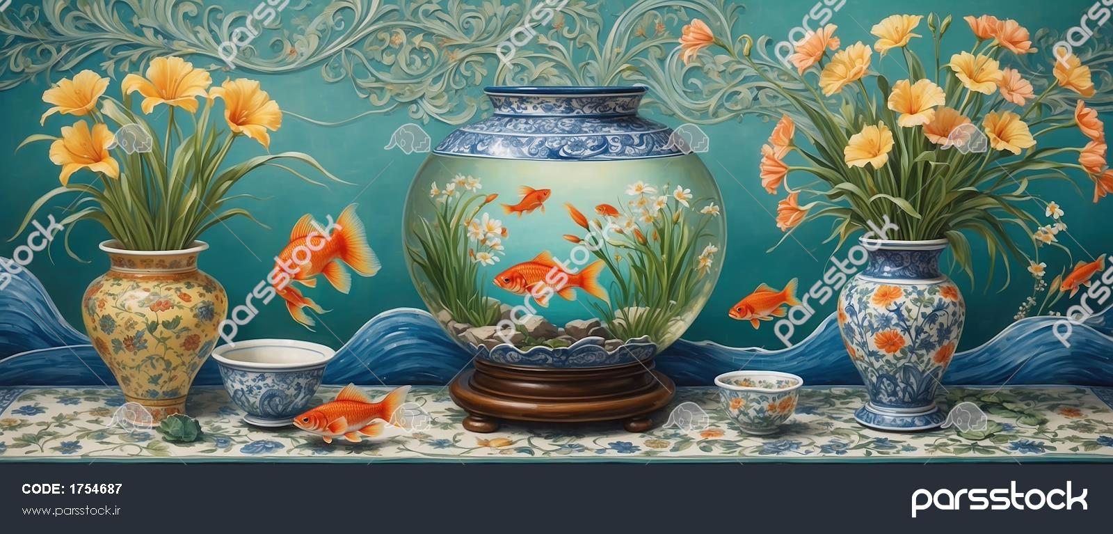 منظره افقی تنگ ماهی قرمز و گلدان در چمنزار برای پوستر نوروز پوستر دیواری نوروز با طرح نقاشی تنگ ماهی گلی و گلدانهای چینی لوکس برای دکوراسیون پذیرایی و بالای کاناپه منظره پانوراما از ماهی گلی در میان گلهای وحشی مناسب پوستر دیواری سه بعدی و دکوراسیون نوروز منظره نوروز رویایی ماهیهای قرمز در آب و گلدانهای گل برای پوستر دیواری پانوراما و عریض اتاق کنفرانس طرح اسلیمی و سنتی ماهی قرمز و گلدان گل برای نوروز طرح سنتی کوزه سفالی با نقاشی ماهی و گلهای بهاری مناسب نوروز بنر افقی دکوراتیو نوروز با طرح آکواریوم گرد و گلدانهای آنتیک چینی و گلهای زرد برای چاپ پوستر دیواری عریض و پرده شید در پذیرایی ترکیب مدرن و سنتی تنگ ماهی و گلدان چینی در پسزمینه فیروزهای برای نوروز و رستورانهای سنتی پوستر سه بعدی لوکس طرح تنگ ماهی و امواج دریا با گلدان های سنتی آبی و سفید ویژه نوروز پوستر دیواری افقی طرح پانوراما تنگ ماهی و گلدانهای چینی با گلهای داوودی زرد ویژه نوروز مشاهده همه