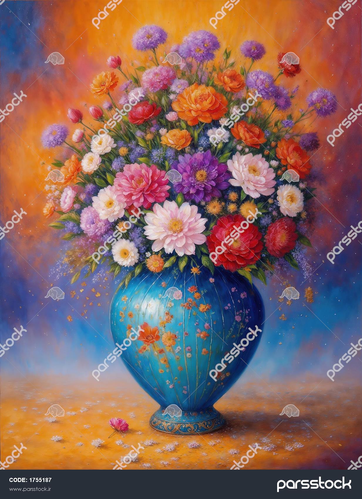 گلدان آبی لاجوردی با گل‌های داوودی و آهار رنگارنگ با سبک نقاشی مدرن مناسب برای پوستر دیواری عمودی و تابلو شاسی