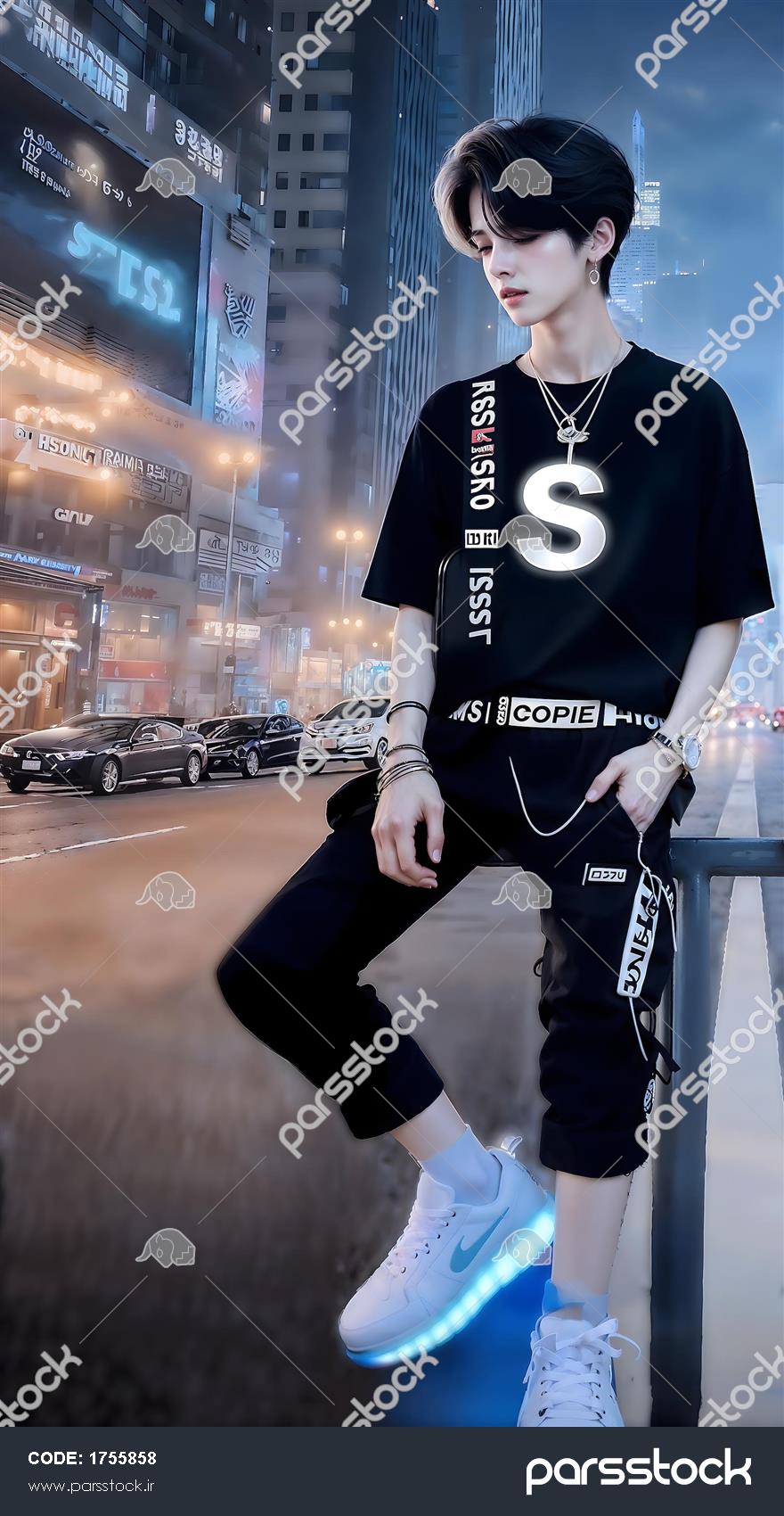 استایل خیابانی پسر جوان با لباس‌های مشکی و کفش‌های نورانی در شهر مدرن مناسب برای پوستر دیواری اتاق نوجوان و گیمینگ