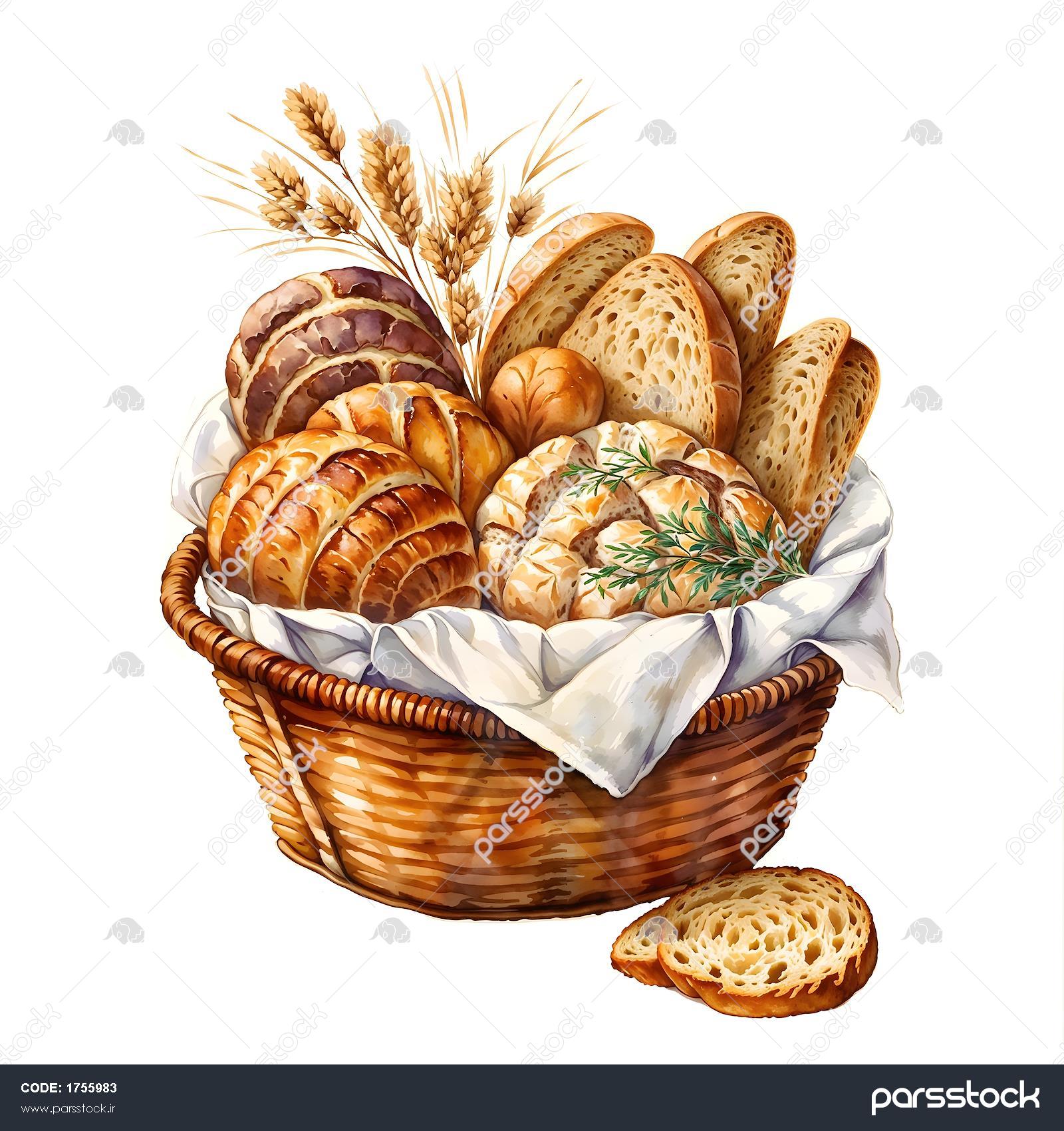 نقاشی آبرنگی انواع نان در سبد چوبی با طراحی کلاسیک مناسب برای پوستر دیواری فودکورت، پرده چاپی آشپزخانه و رومیزی